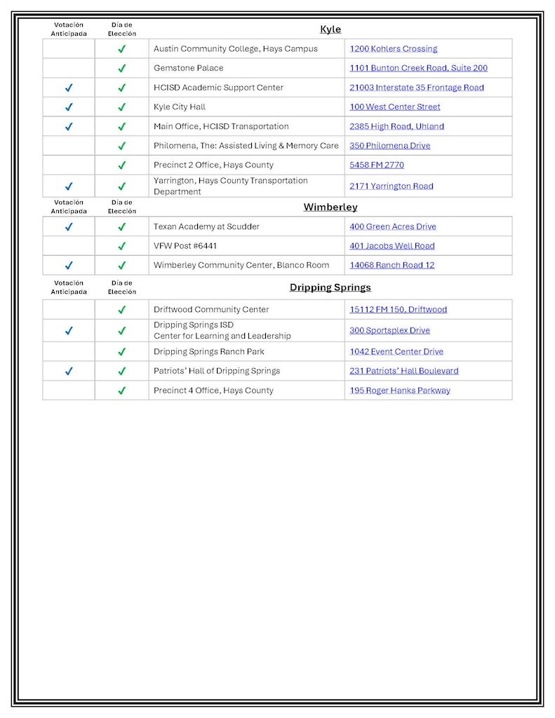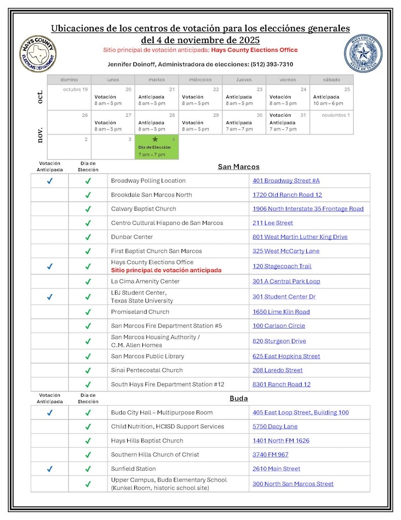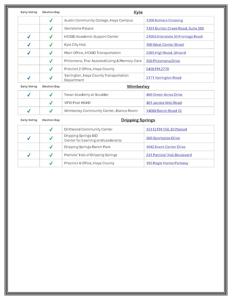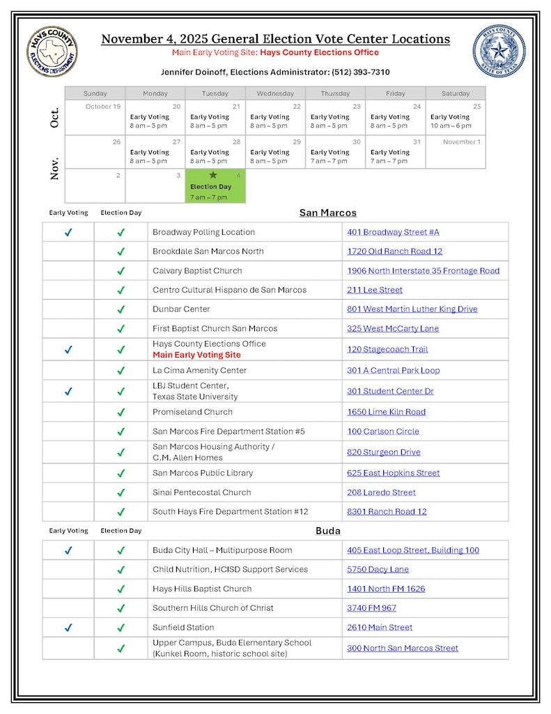 Hays County Elections Administrator list of Fall 2025 Vote Center Locations -